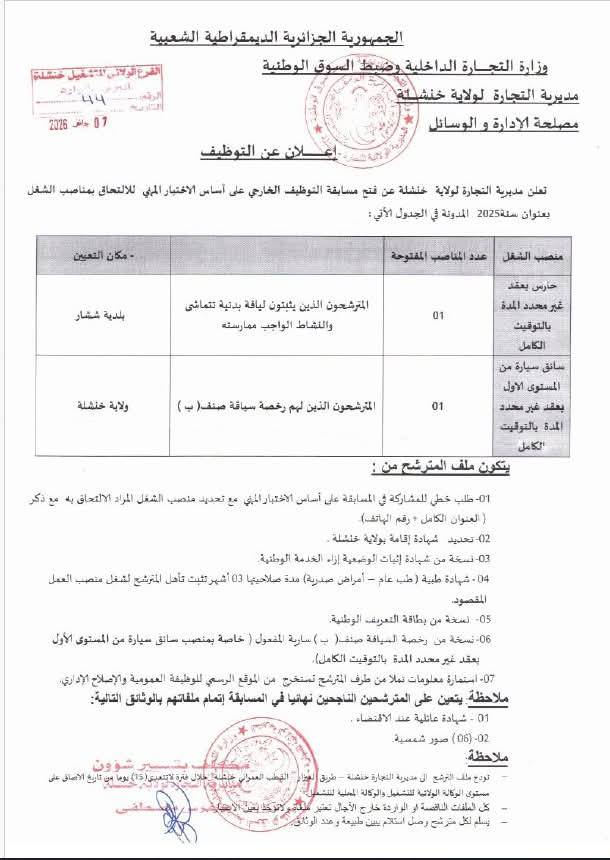 تعلن مديرية التجارة لولاية خنشلة عن فتح مسابقة توظيف على أساس الشهادات للالتحاق بالرتبة المبينة أدناه: