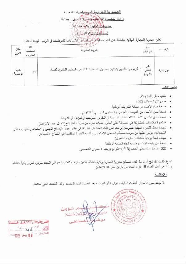 تعلن مديرية التجارة لولاية خنشلة عن فتح مسابقة توظيف على أساس الشهادات للالتحاق بالرتبة المبينة أدناه: