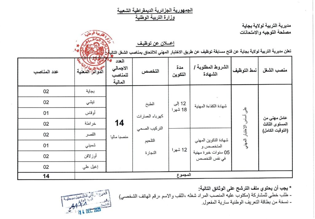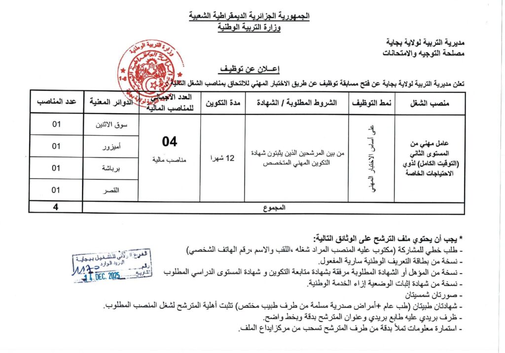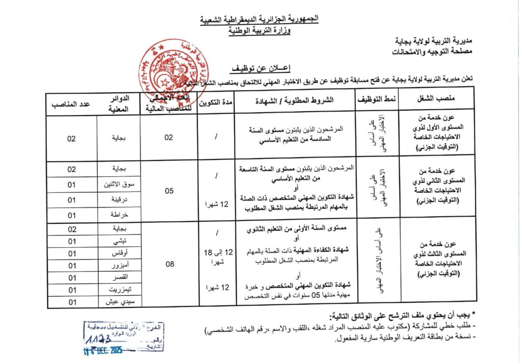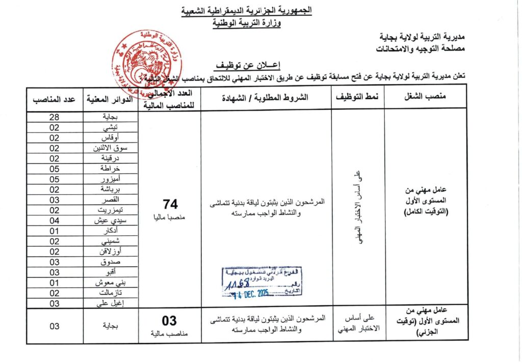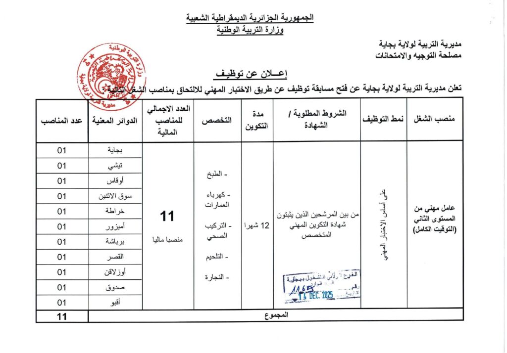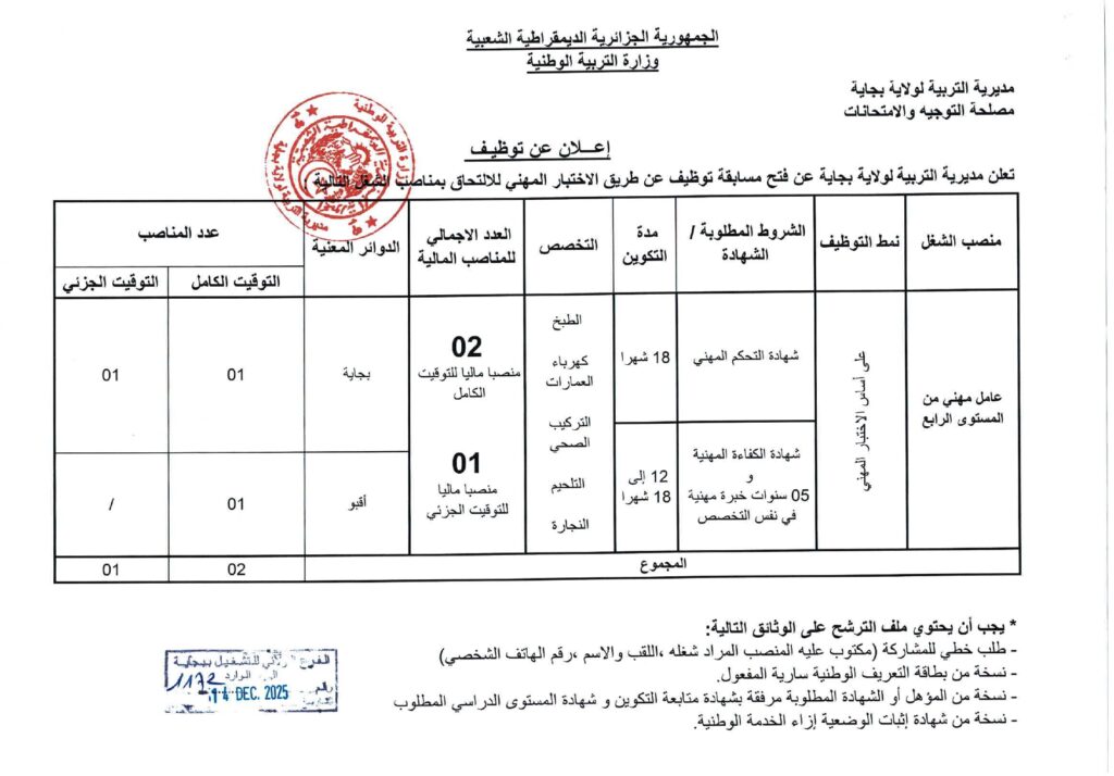تعلن مديرية التربية لولاية بجاية عن فتح مسابقات توظيف على أساس الاختبار المهني للالتحاق بالرتب التالية: