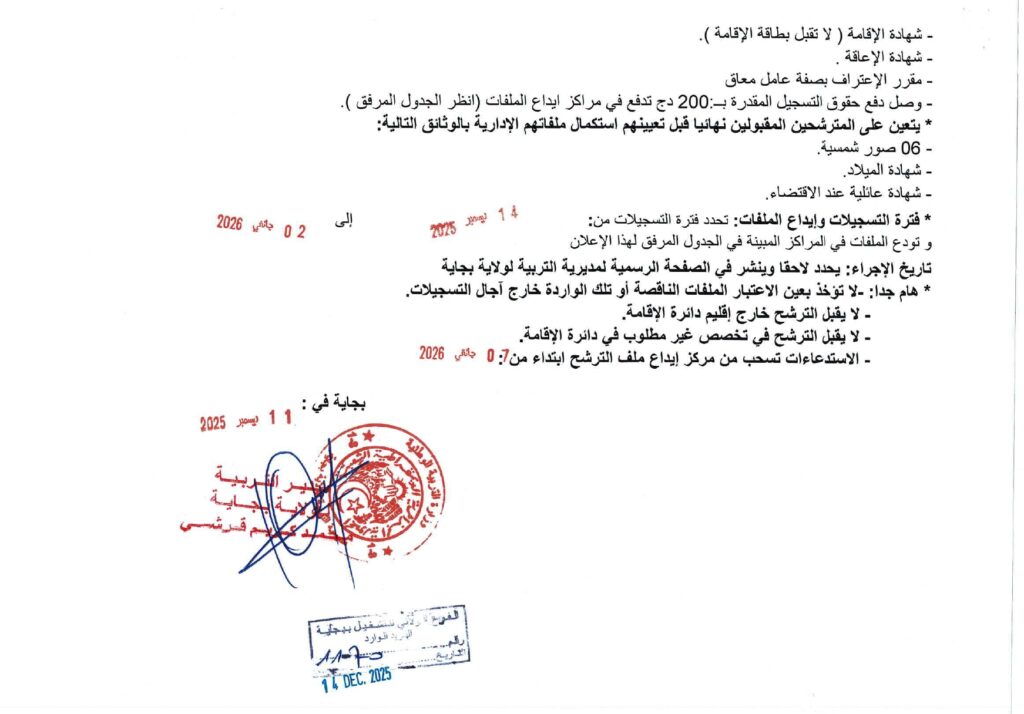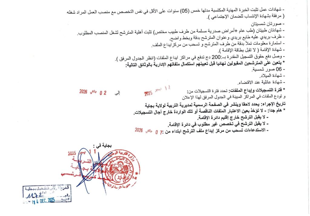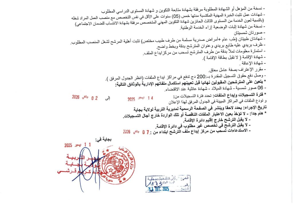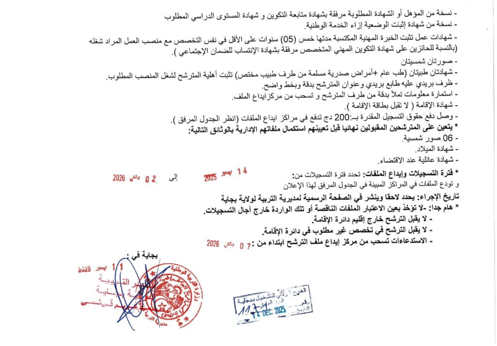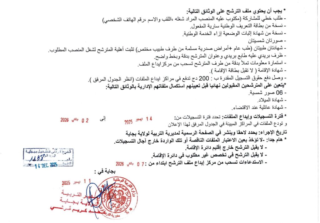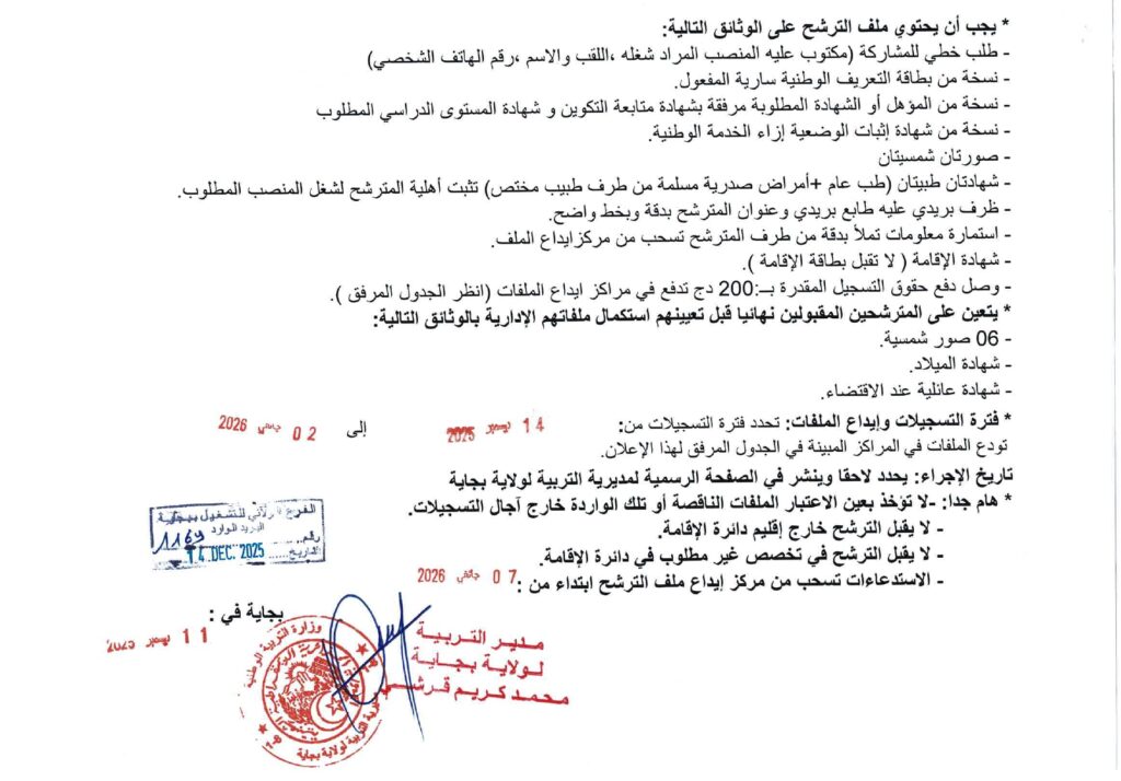 تعلن مديرية التربية لولاية بجاية عن فتح مسابقات توظيف على أساس الاختبار المهني للالتحاق بالرتب التالية: