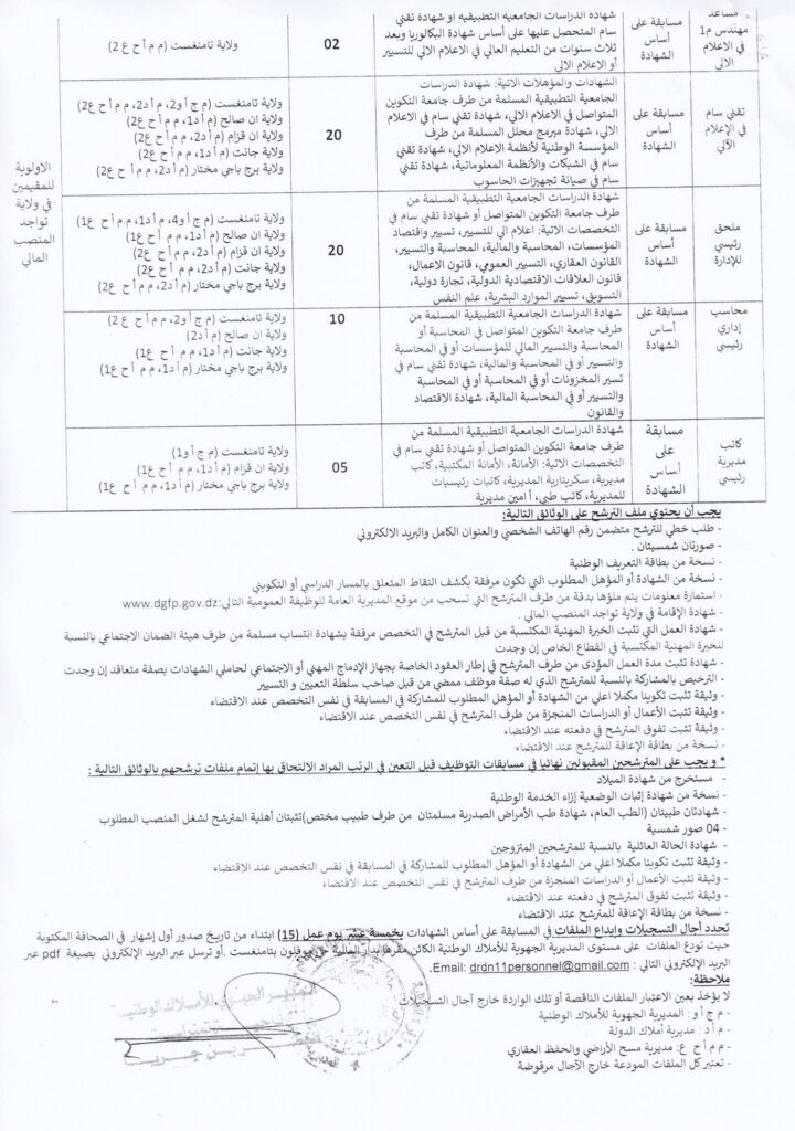 المديرية الجهوية للأملاك الوطنية – دار المالية أو عبر البريد الإلكتروني (PDF):drdn11personnel@gmail.com