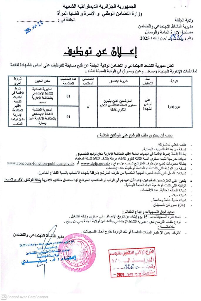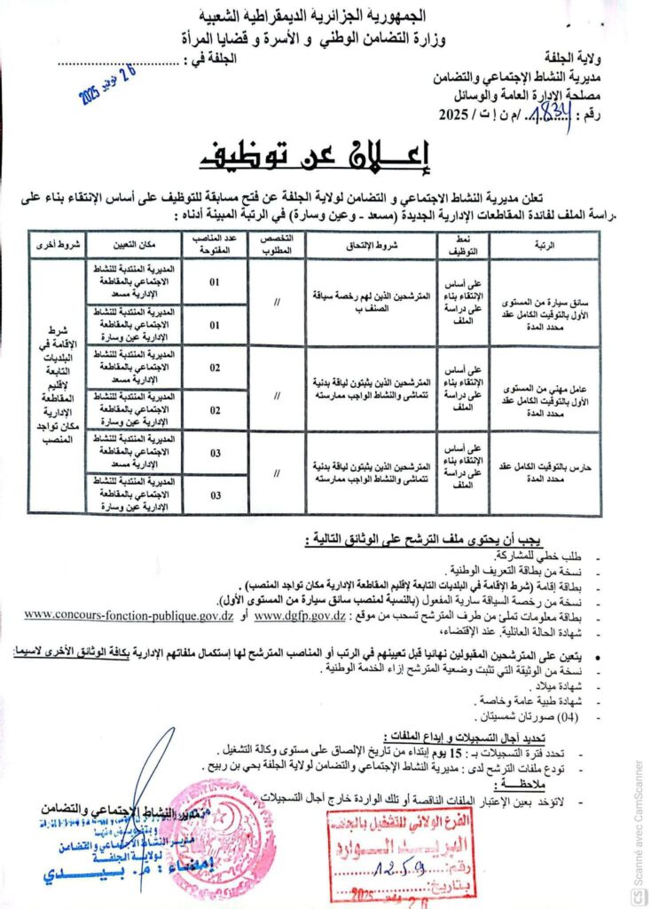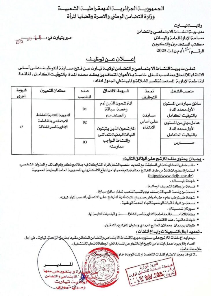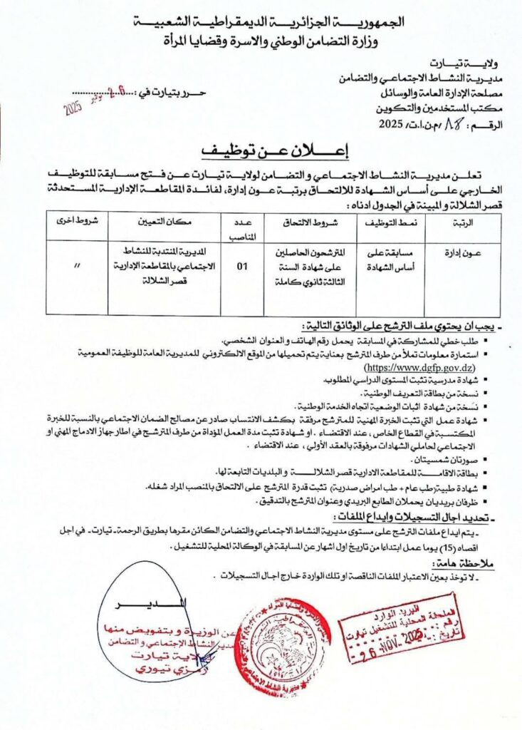 اعلان فتح مسابقات توظيف بمديرية النشاط الاجتماعي والتضامن ولايتي تيارت والجلفة