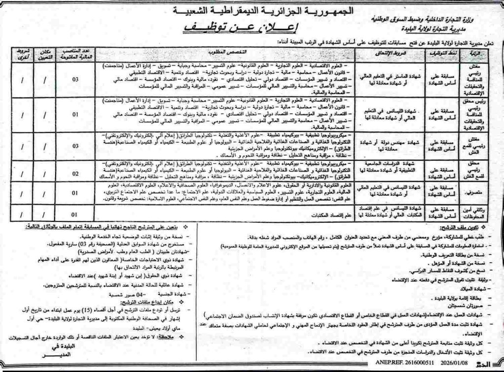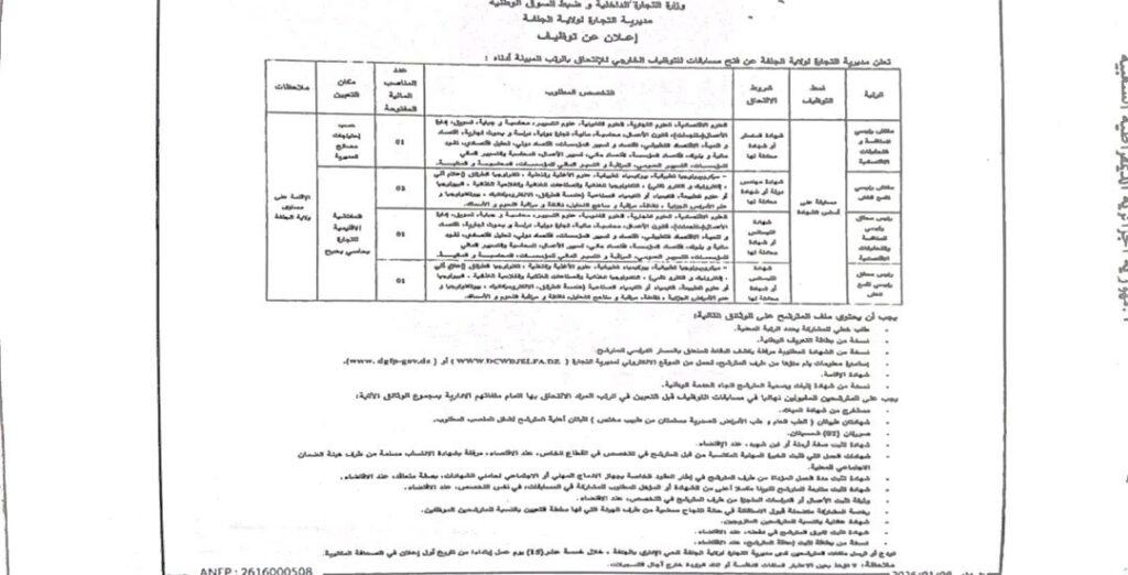 تُعلن مديرية التجارة لولاية الجلفة عن فتح مسابقات توظيف خارجية على أساس الشهادة للالتحاق بالرتب التالية، وذلك حسب الشروط والتخصصات المطلوبة: