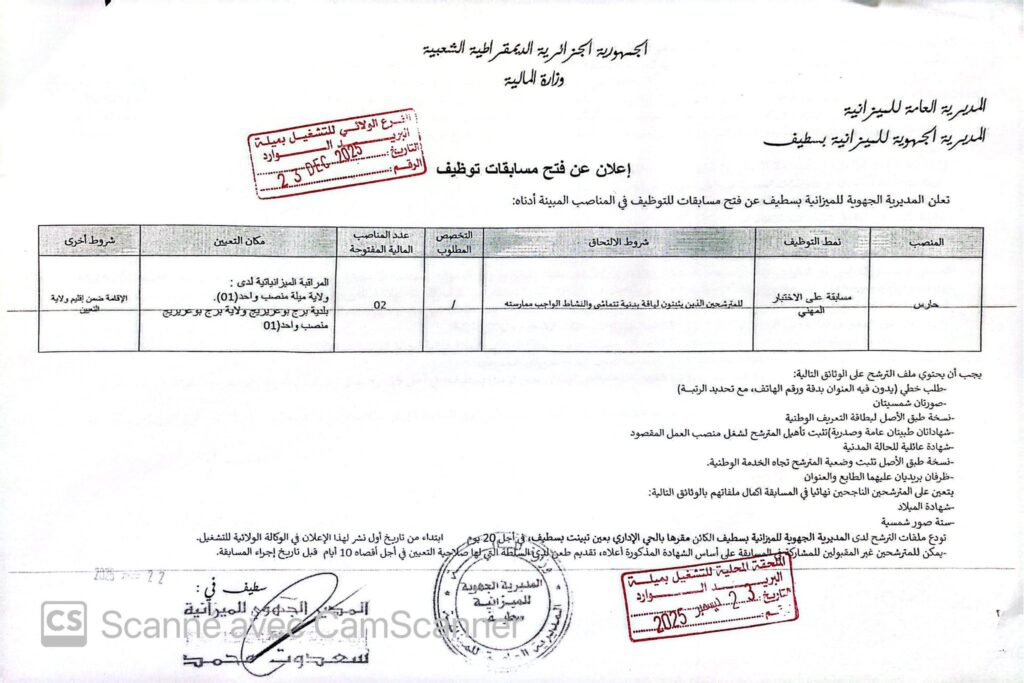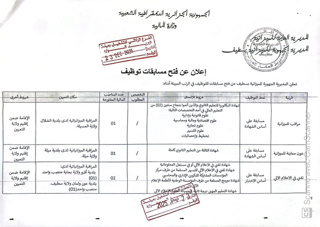 اعلان فتح مسابقات للتوظيف بالمديرية الجهوية للميزانية بسطيف
