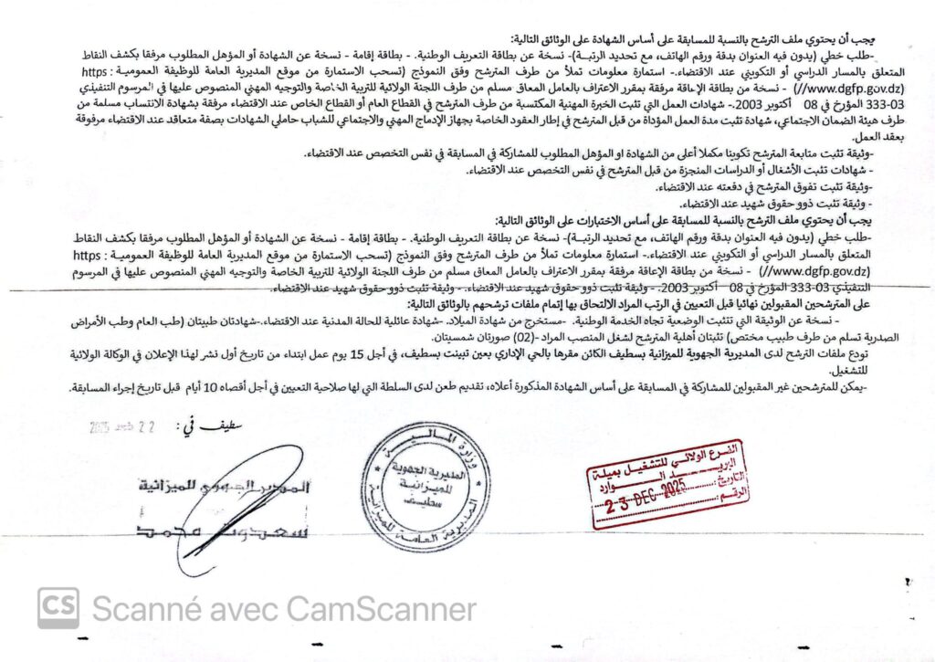 • تُودع ملفات الترشح لدى المديرية الجهوية للميزانية بسطيف، الكائن مقرها بالحي الإداري بعين تبينت – سطيف.