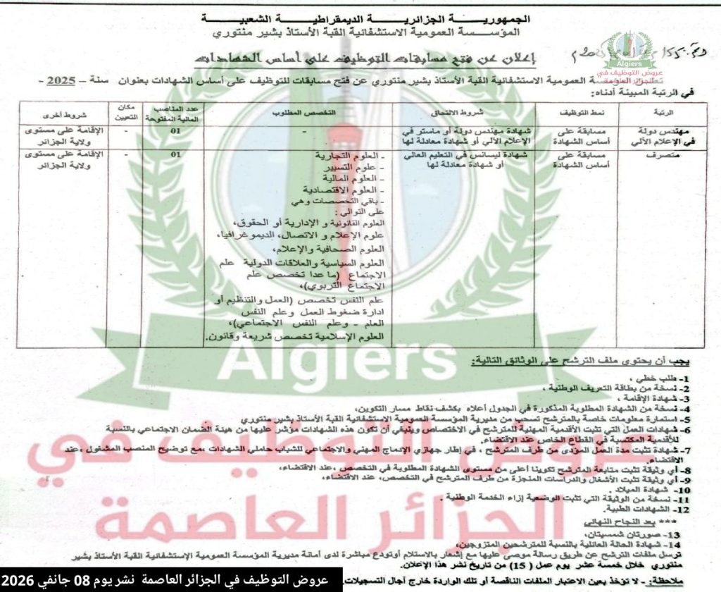 تعلن إدارة المؤسسة العمومية الاستشفائية القبة الأستاذ بشير منتوري عن فتح مسابقات للتوظيف على أساس الشهادات بعنوان سنة – 2025 – في الرتب المبينة أدناه: