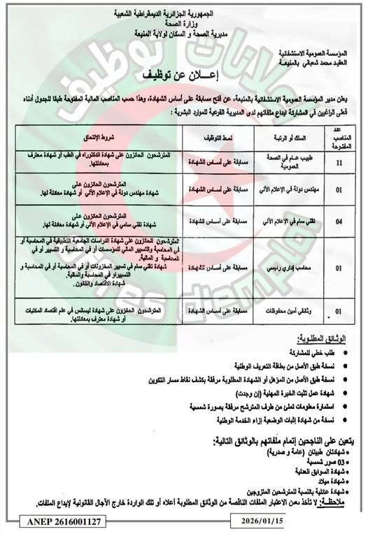 تعلن المؤسسة العمومية الاستشفائية بالمنيعة عن فتح مسابقة على أساس الشهادة للالتحاق بالرتب والمناصب التالية: