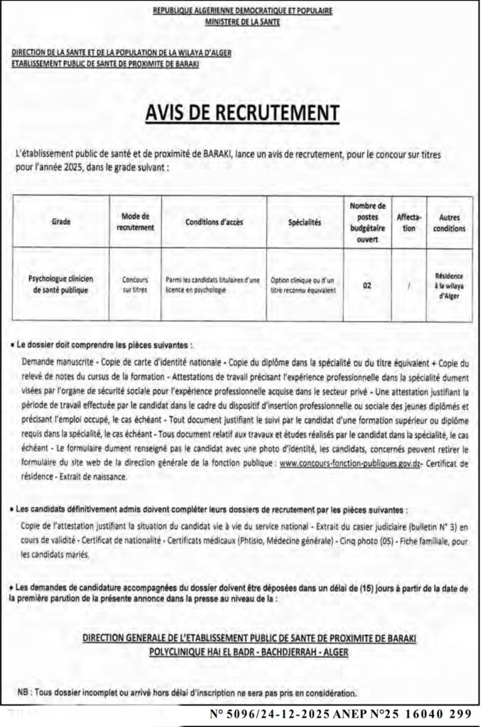 تعلن المؤسسة العمومية للصحة الجوارية براقي عن فتح مسابقة توظيف على أساس الشهادة بعنوان سنة 2025، للالتحاق بالرتبة التالية: