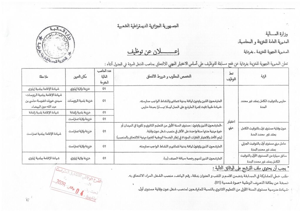 تعلن المديرية الجهوية للخزينة بغرداية عن فتح مسابقة للتوظيف على أساس الاختبار المهني للالتحاق بمناصب الشغل المبينة أدناه:
