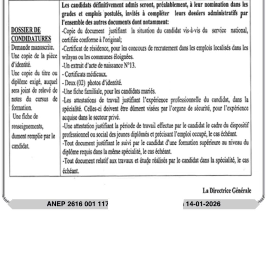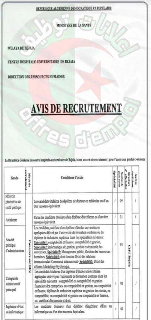 تعلن السيدة المديرة العامة للمركز الاستشفائي الجامعي بجاية عن فتح مسابقة توظيف للالتحاق بالرتب المبينة أدناه:
