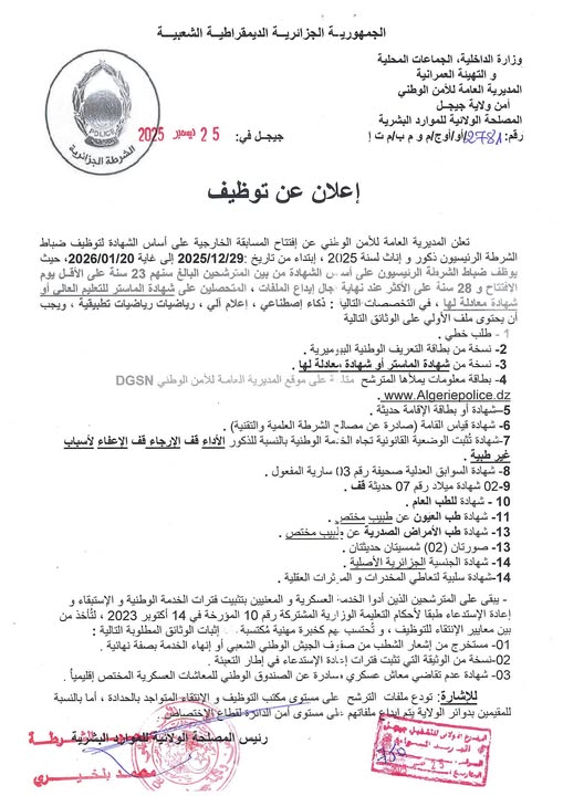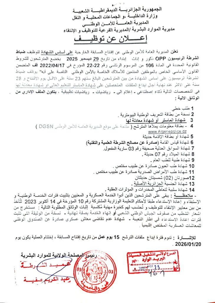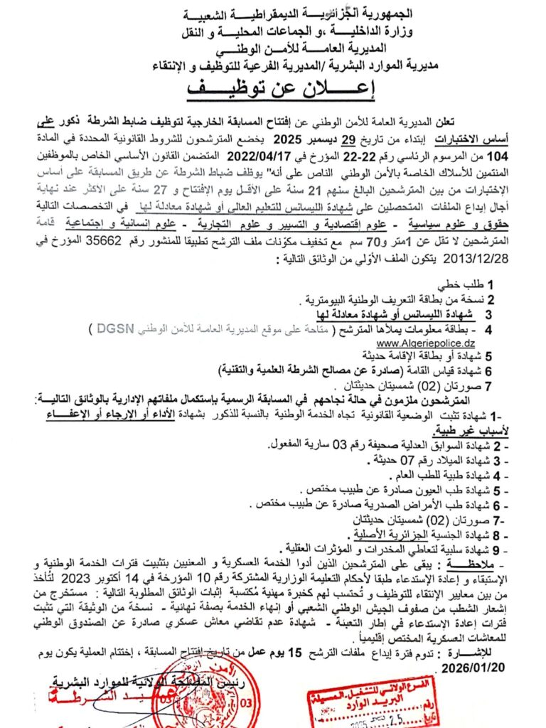 تعلن المديرية العامة للأمن الوطني عن فتح مسابقة خارجية على أساس الشهادة لتوظيف ضباط الشرطة الرئيسيين (ذكور وإناث)، ابتداءً من 29 ديسمبر 2025.