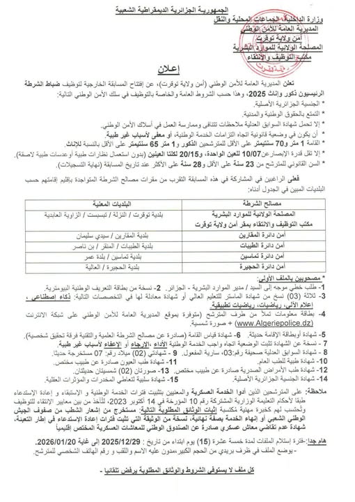 تعلن المديرية العامة للأمن الوطني عن فتح مسابقة خارجية لتوظيف ضباط الشرطة (ذكور) على أساس الاختبارات، ابتداءً من 29 ديسمبر 2025.