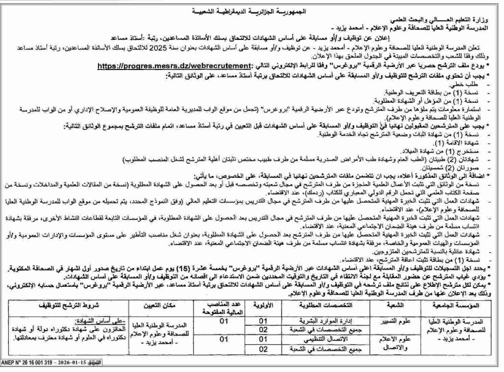 تعلن المدرسة الوطنية العليا للصحافة وعلوم الإعلام – أحمد يزيد – عن فتح توظيف و/أو مسابقة على أساس الشهادات للالتحاق بسلك الأساتذة المساعدين – رتبة أستاذ مساعد، وذلك وفقًا للشعب والتخصصات المبينة في الجدول أدناه.