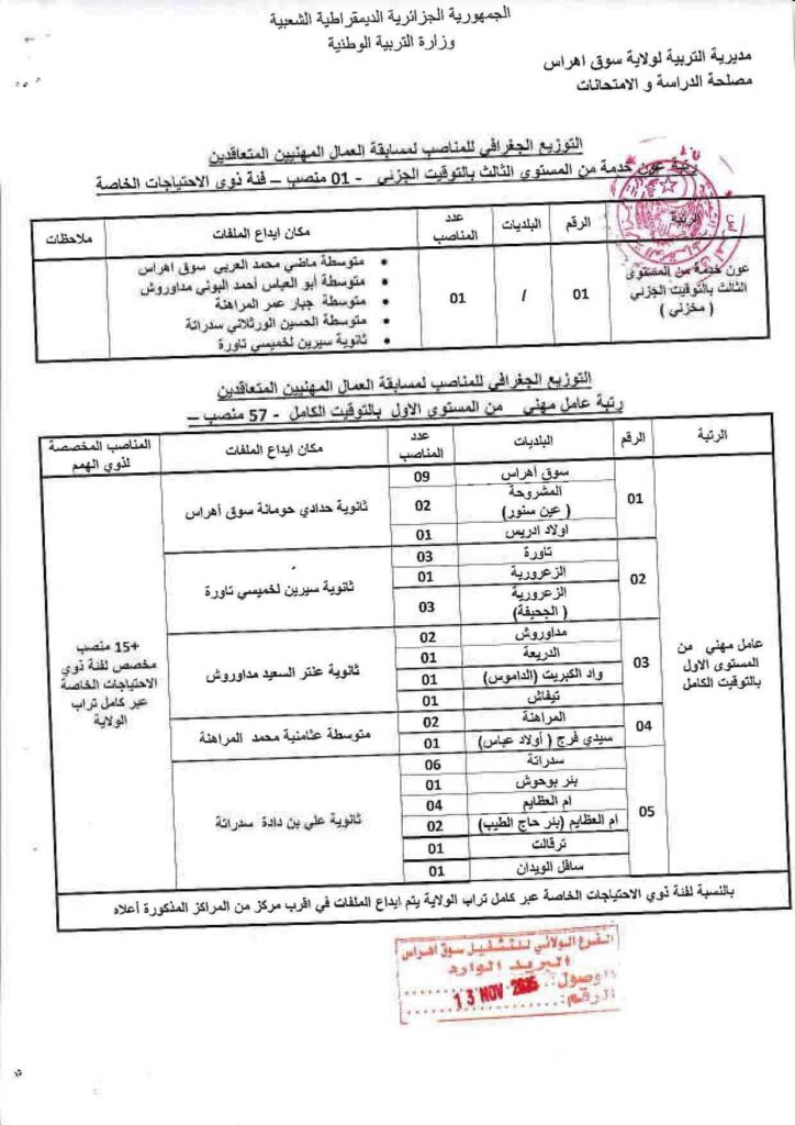 تعلن مديرية التربية لولاية سوق اهراس عن فتح مسابقة توظيف على اساس الاختبار المهني للالتحاق بالرتب التالية