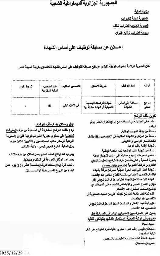 تعلن مديرية الضرائب لولاية غليزان عن فتح مسابقة توظيف على أساس الشهادة للالتحاق بالرتبة المبينة أدناه: