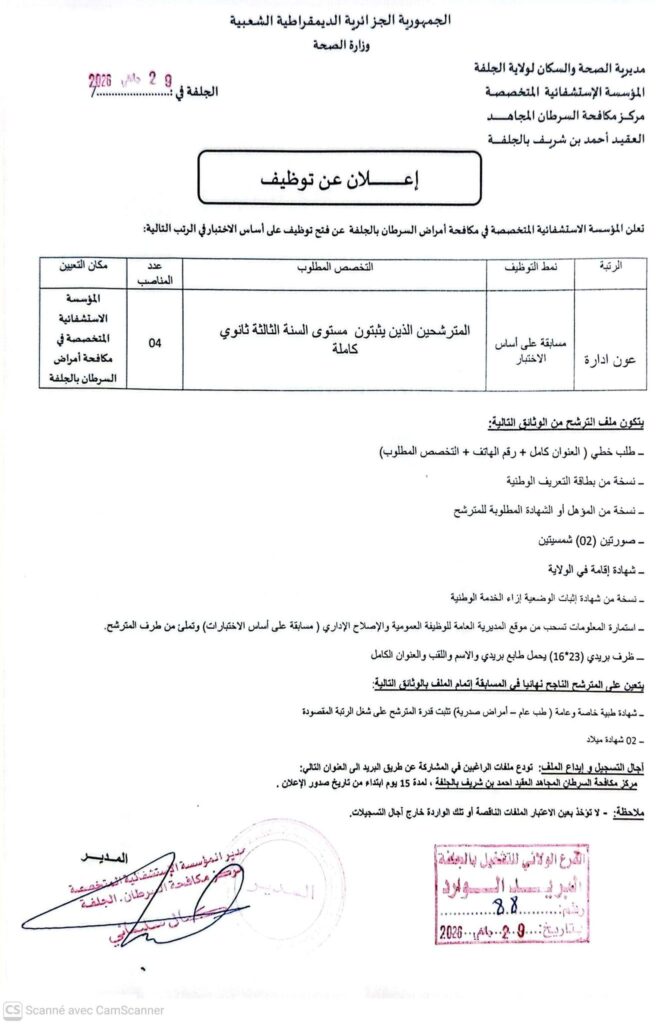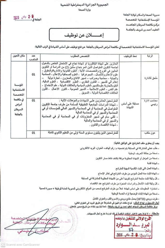 تعلن المؤسسة الاستشفائية المتخصصة في مكافحة أمراض السرطان بالجلفة عن فتح توظيف على أساس الشهادة في الرتب التالية: