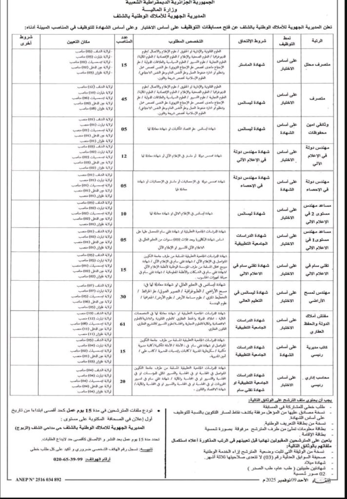 تعلن المديرية الجهوية للأملاك الوطنية بالشلف عن فتح مسابقات للتوظيف على أساس الاختبار والشهادة، وذلك للتوظيف في المناصب المبينة أدناه:
