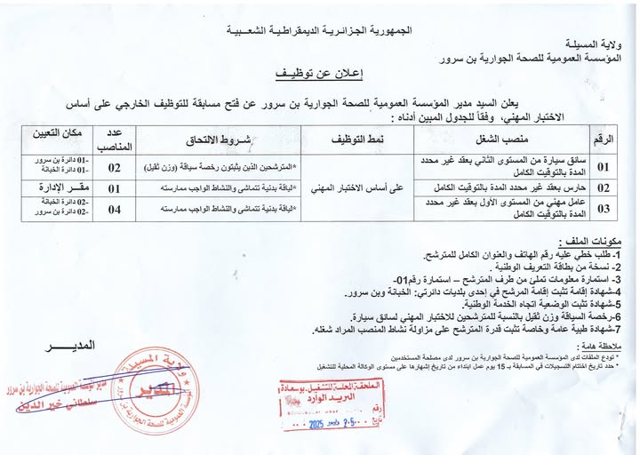 تعلن المؤسسة العمومية للصحة الجوارية بمسعد عن فتح مسابقة توظيف على أساس الاختبار المهني للالتحاق برتبة عامل مهني من المستوى الأول بالتوقيت الكامل، بعقد غير محدد المدة، بعنوان سنة 2025، وفق التفاصيل التالية: