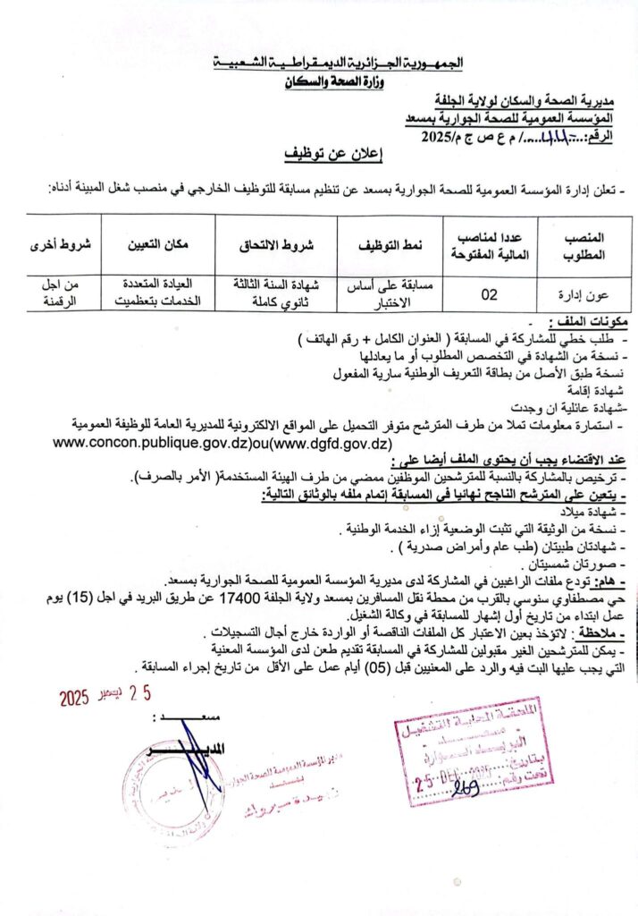 تعلن المؤسسة العمومية للصحة الجوارية بمسعد عن فتح مسابقة توظيف على أساس الاختبار المهني للالتحاق برتبة عامل مهني من المستوى الأول بالتوقيت الكامل، بعقد غير محدد المدة، بعنوان سنة 2025، وفق التفاصيل التالية: