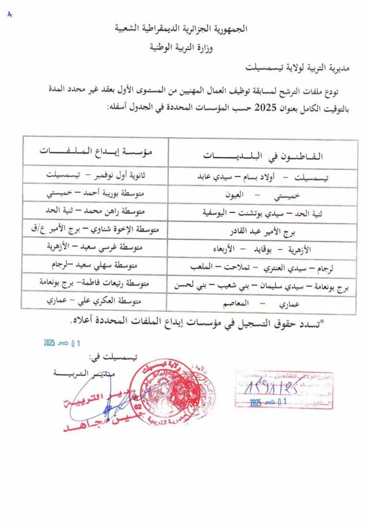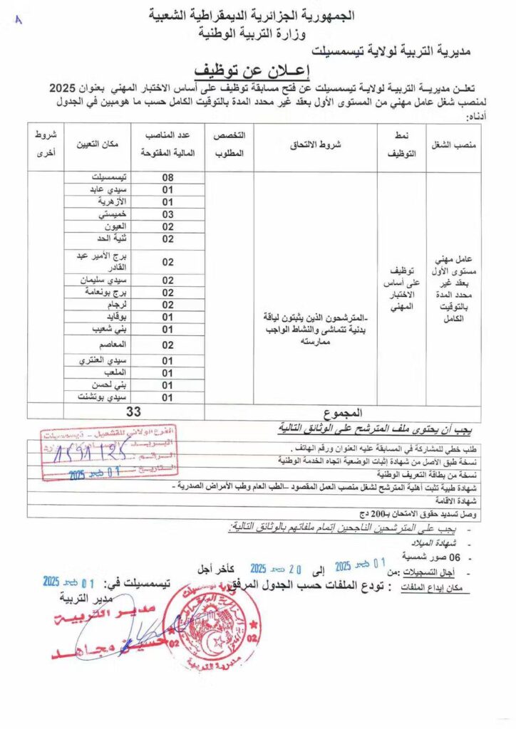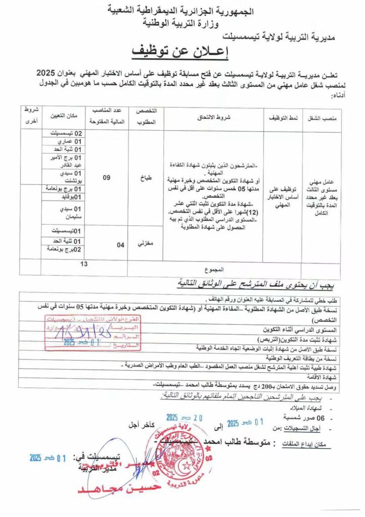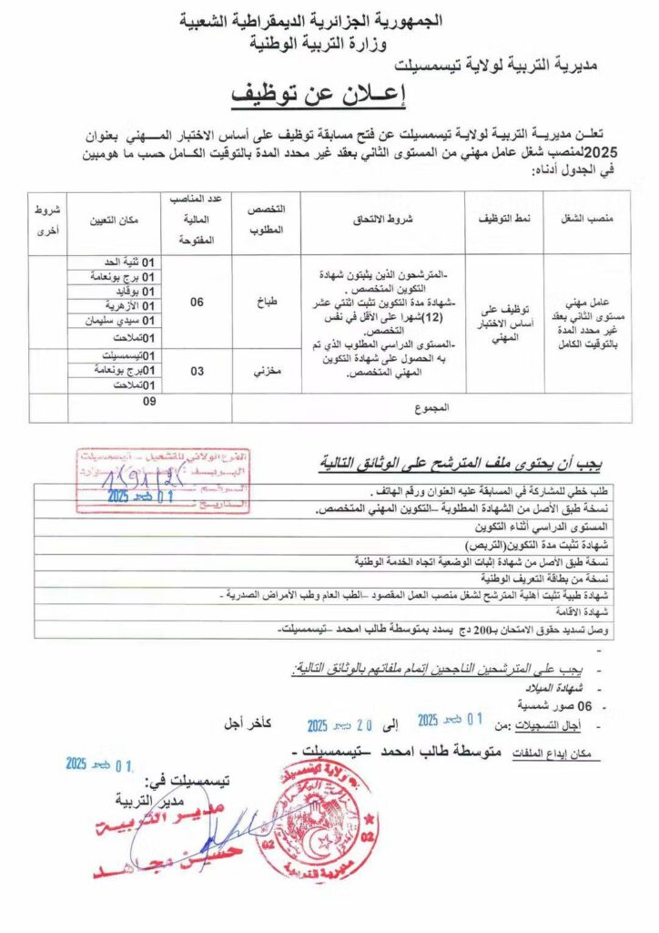 تعلن مديرية التربية لولاية تيسمسيلت عن فتح مسابقات توظيف للعمال المهنيين على أساس الاختبار المهني لسنة 2025 حسب المستويات المختلفة: