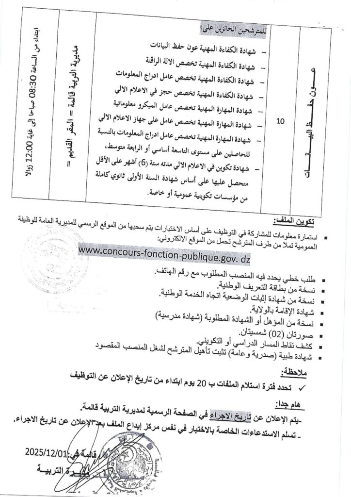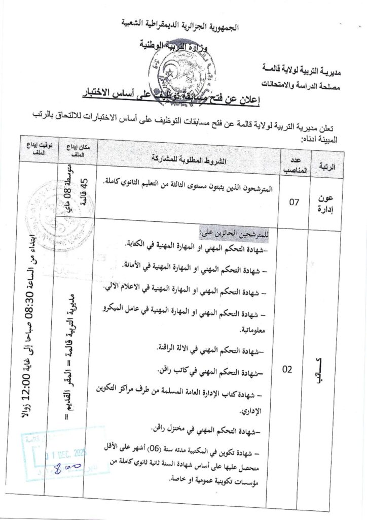 ملاحظة: الإعلان عن تاريخ إجراء المسابقة سيكون على الصفحة الرسمية لمديرية التربية قالمة.
