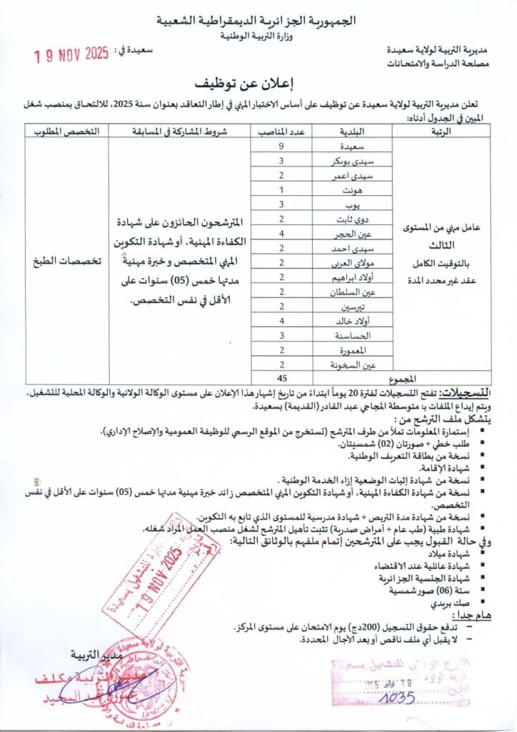 اعلان مسابقات توظيف في مديرية التربية لولاية سعيدة