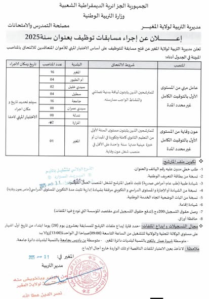 تعلن مديرية التربية لولاية المغير عن فتح مسابقة للتوظيف على أساس الاختبار المهني للأعوان المتعاقدين للالتحاق بالمناصب المبينة أدناه: