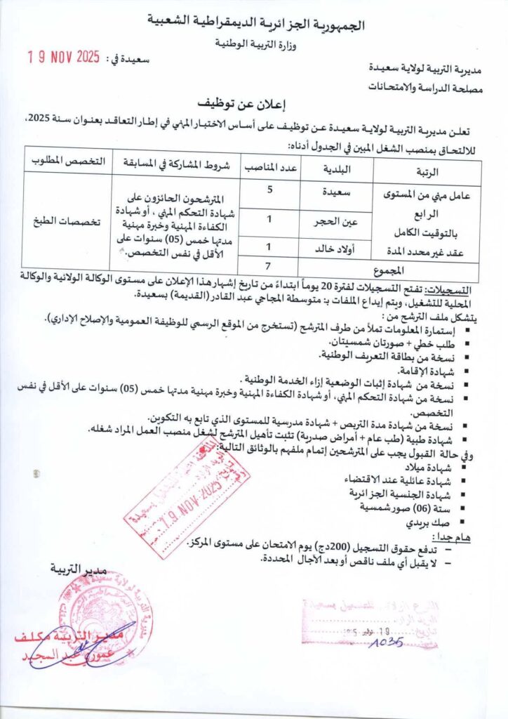 اعلان مسابقات توظيف في مديرية التربية لولاية سعيدة