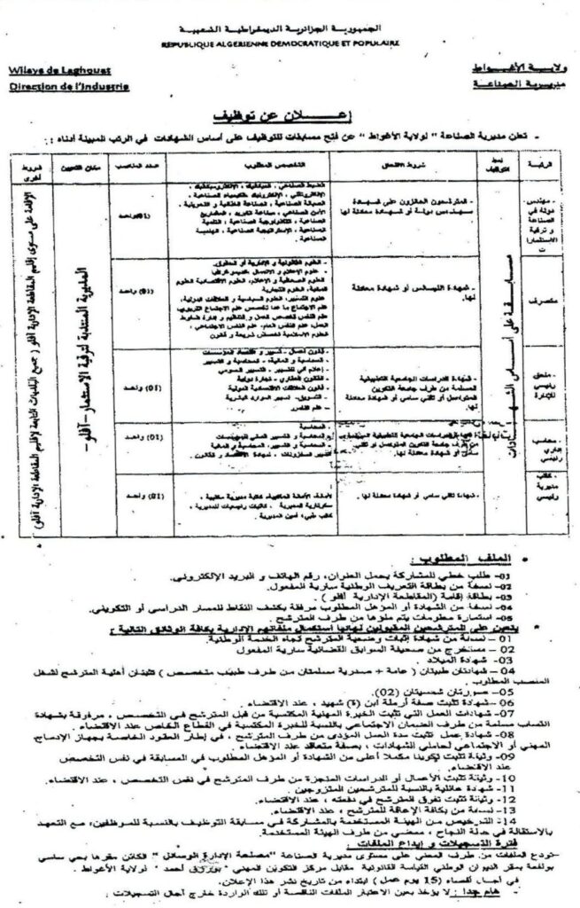 تعلن مديرية الصناعة لولاية الأغواط عن فتح مسابقات للتوظيف على أساس الشهادات في الرتب المبينة أدناه: