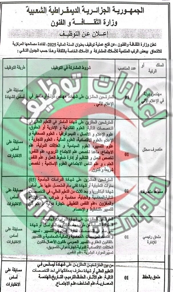 تعلن وزارة الثقافة والفنون عن فتح عملية توظيف بعنوان السنة المالية 2025، لفائدة مصالحها المركزية للالتحاق ببعض الرتب المنتمية للأسلاك المشتركة والأسلاك الخاصة بالثقافة، وفق الجدول التالي: