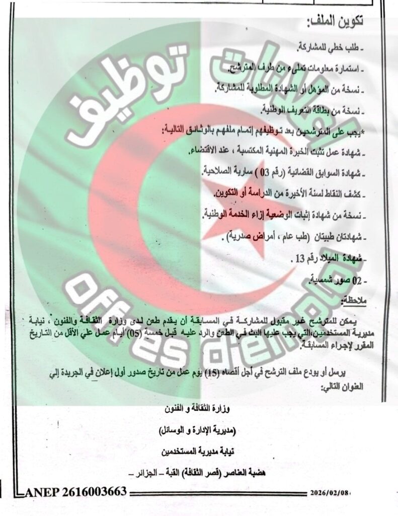 تودع الملفات بمقر:وزارة الثقافة والفنون(مديرية الإدارة والوسائل) نيابة مديرية المستخدمين هضبة العناصر (قصر الثقافة) القبة – الجزائر.