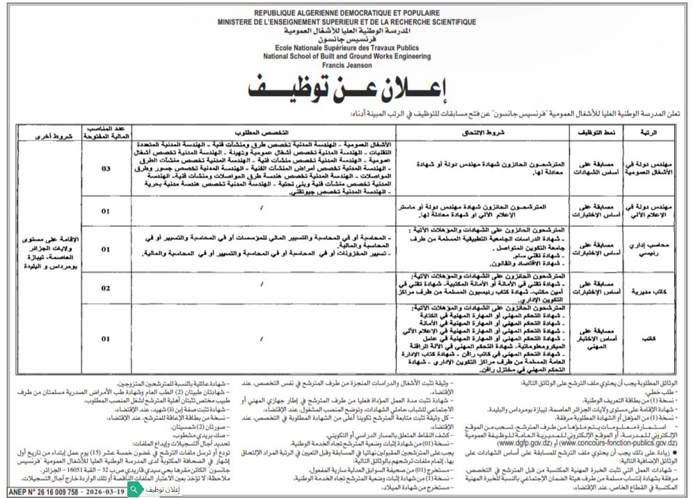 تعلن المدرسة الوطنية العليا للأشغال العمومية “فرنسيس جانسون” عن فتح مسابقات للتوظيف في الرتب المبينة أدناه: