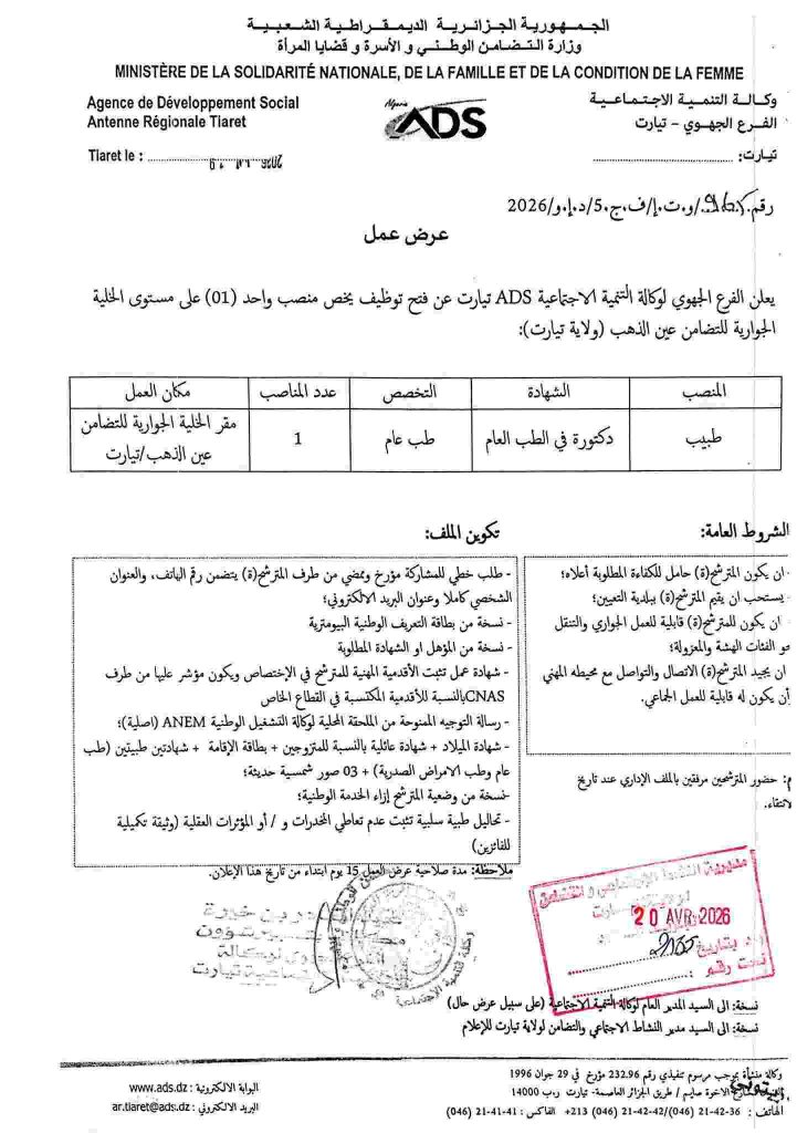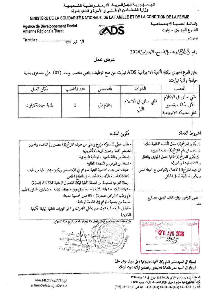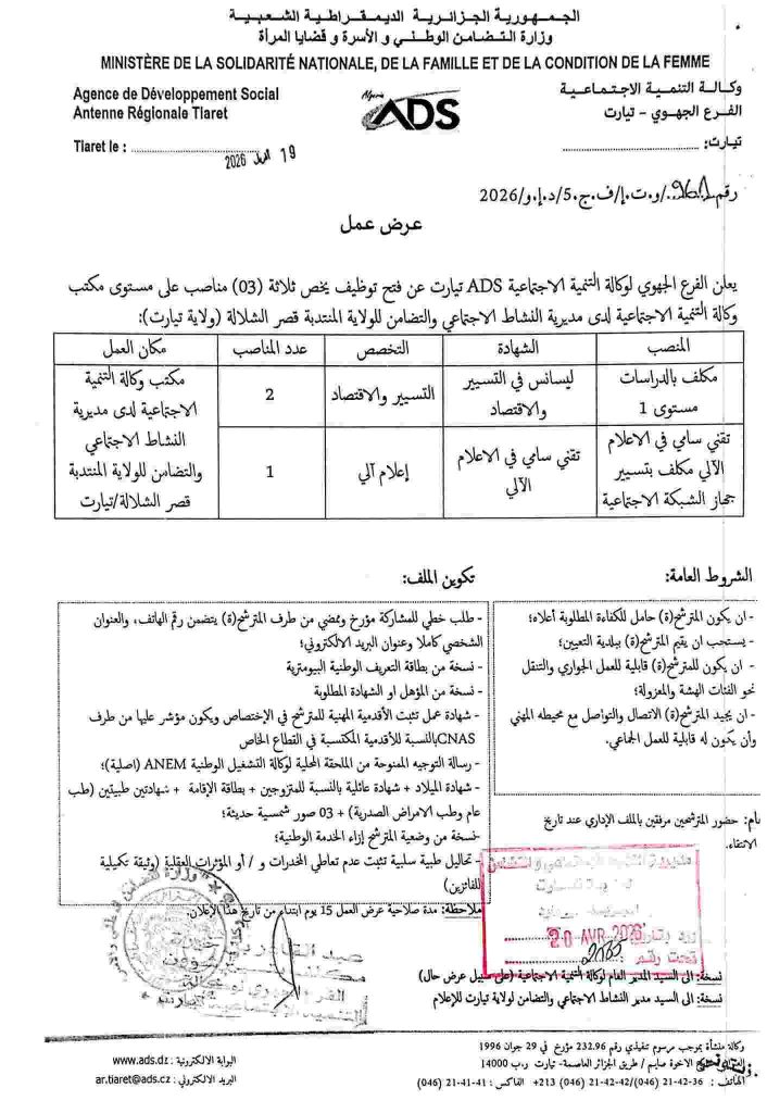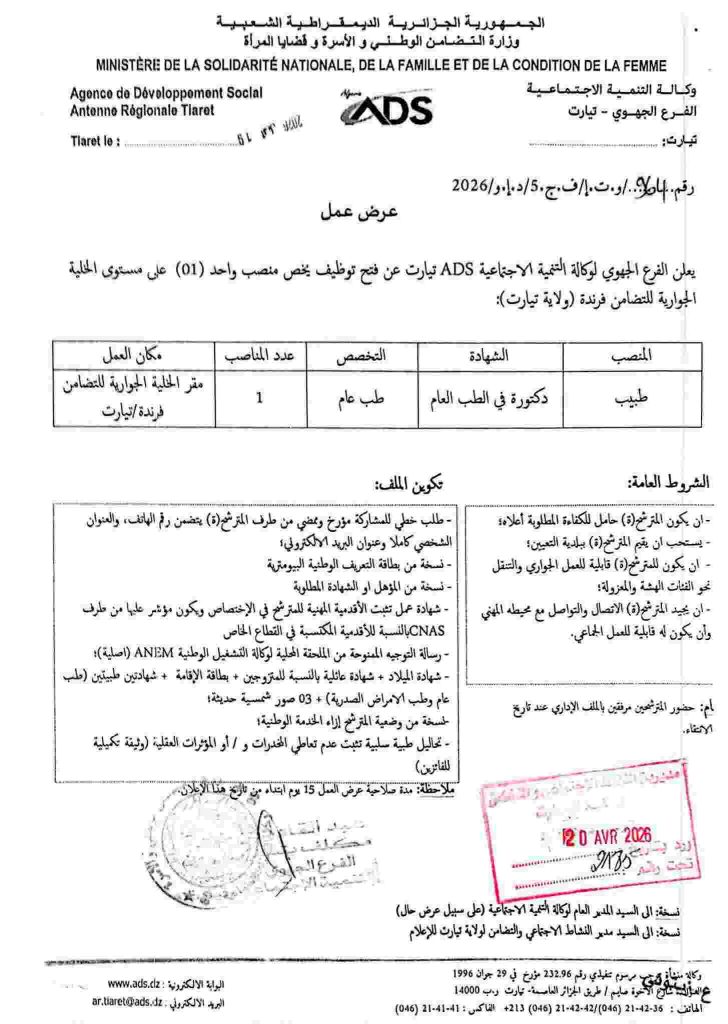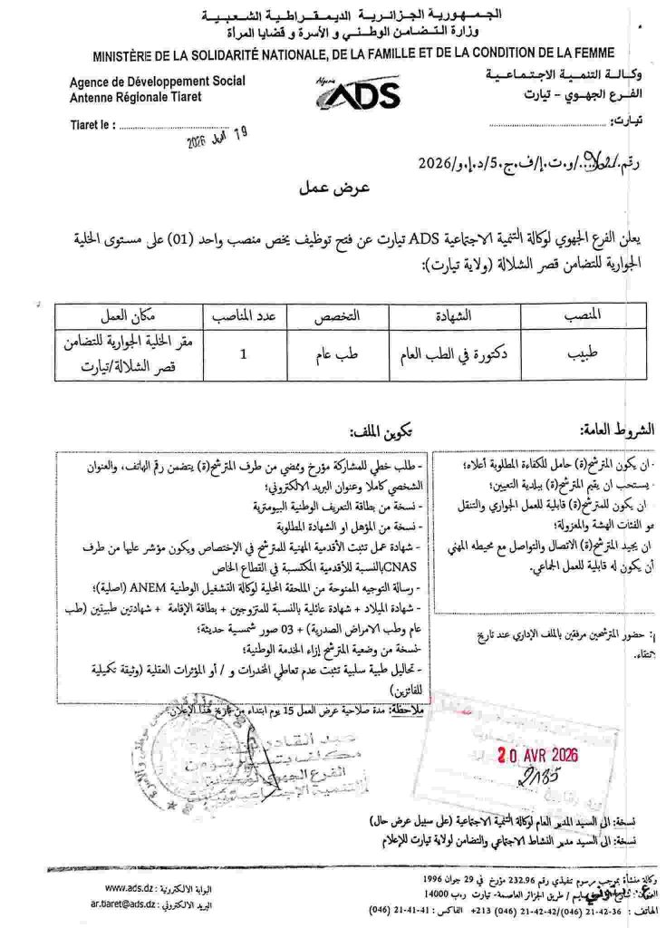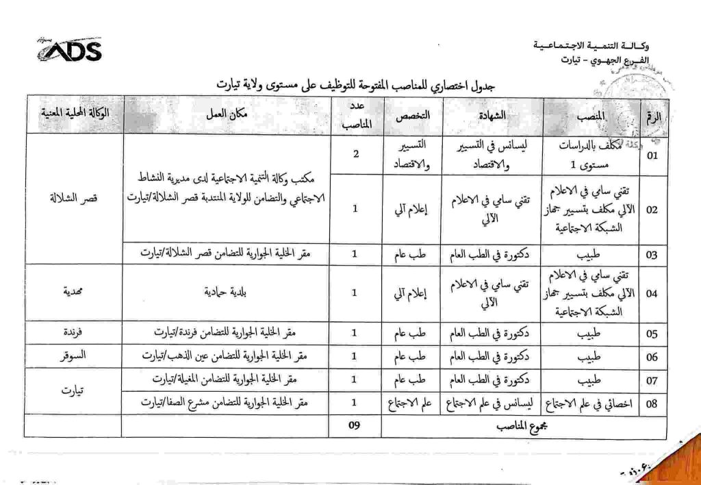 علن الفرع الجهوي لوكالة التنمية الاجتماعية ADS تيارت عن فتح توظيف ) على مستوى الخلية الجوارية للتضامن قصر الشلالة (ولاية تيارت):