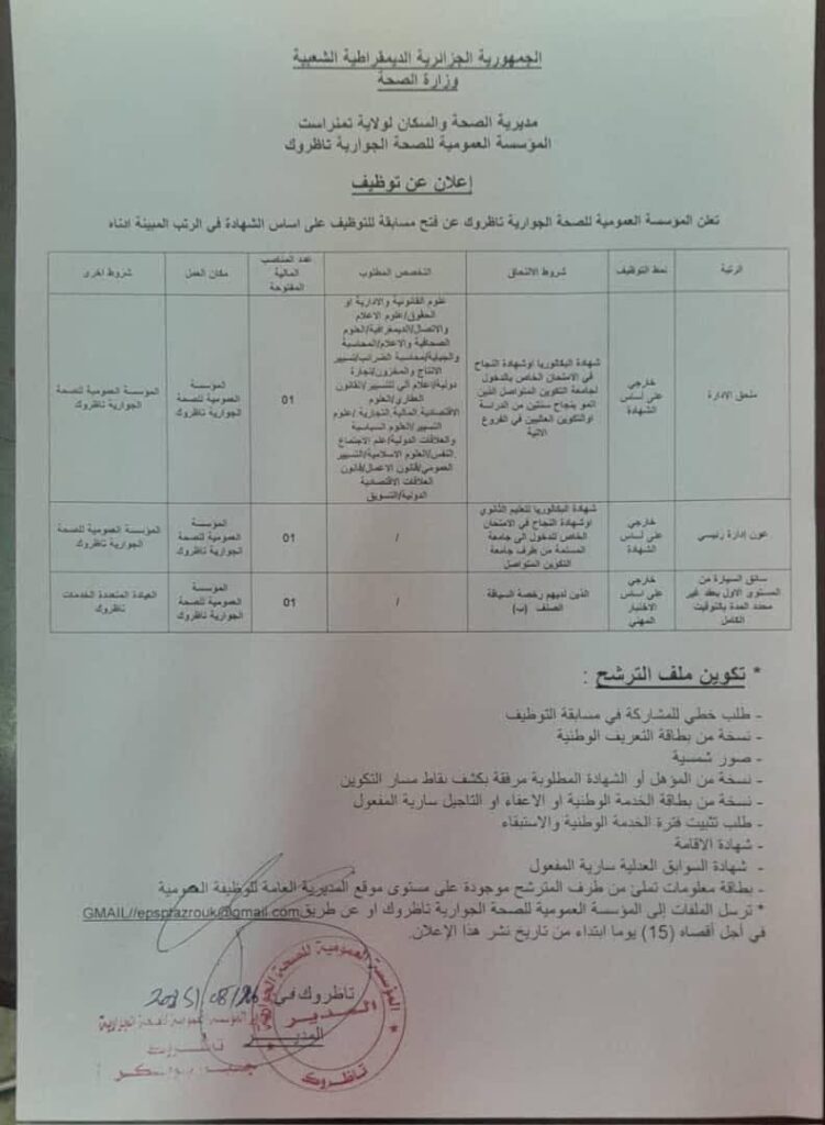 اعلان مسابقة توظيف بالمؤسسة العمومية للصحة الجوارية ناظروك تمنراست
