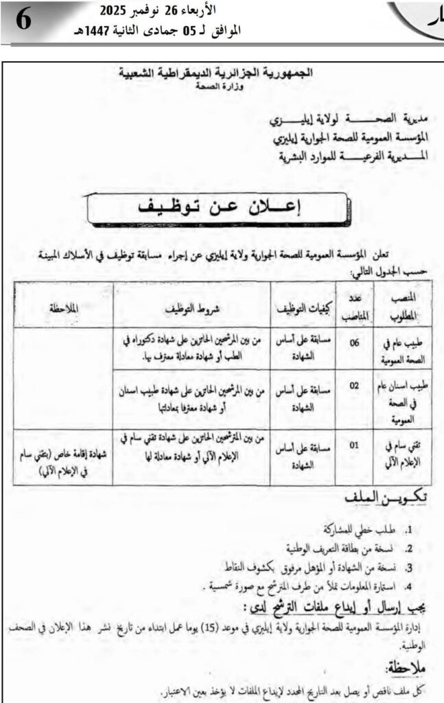 تعلن المؤسسة العمومية للصحة الجوارية – ولاية إيليزي عن فتح مسابقة توظيف في الرتب المبينة في الجدول التالي: