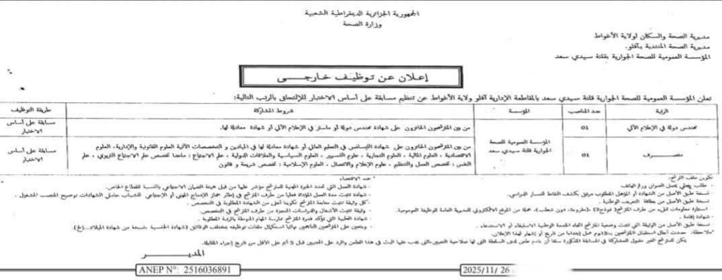 اعلان مسابقة توظيف بالمؤسسة العمومية للصحة الجوارية ولاية إيليزي والاغواط