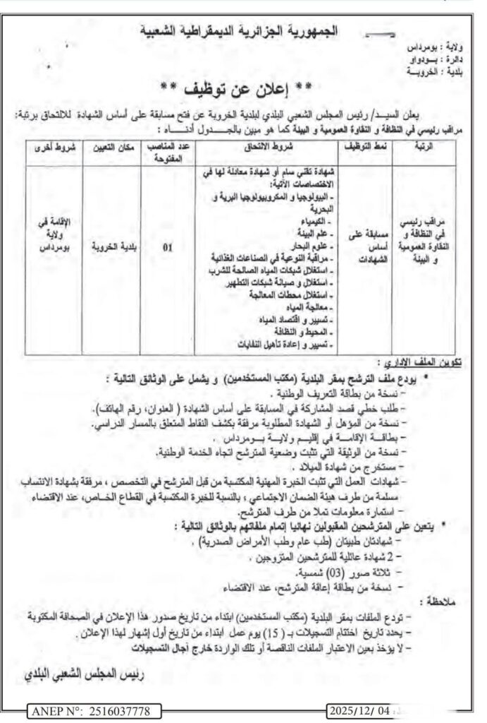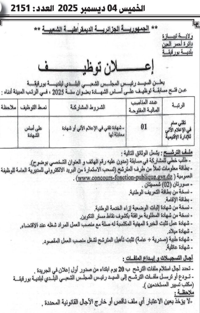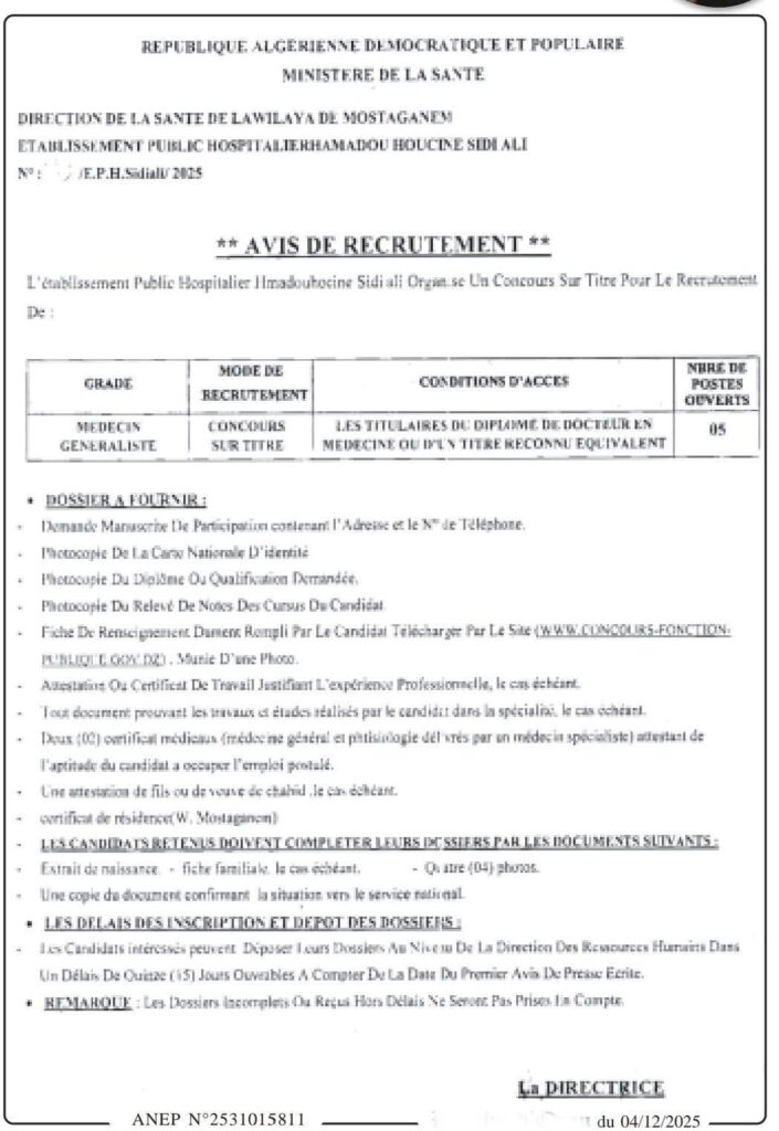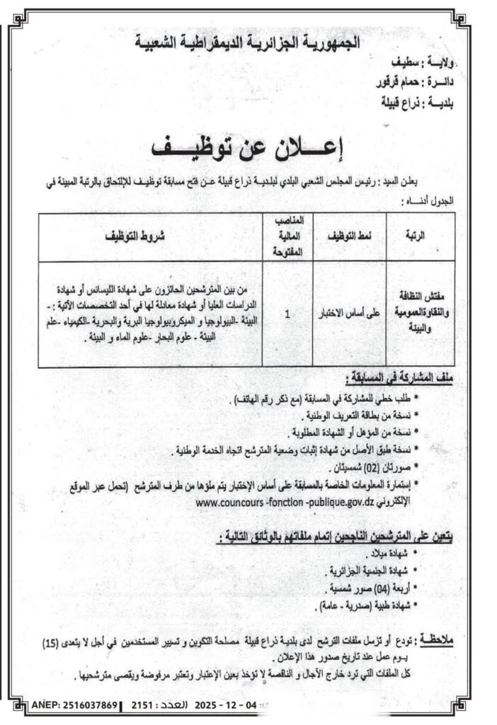 تعلن مؤسسات الوظيف العمومي بولايات مستغانم.بومرداس.تيبازة.سطيف عن فتح توظيف في الرتب التالية