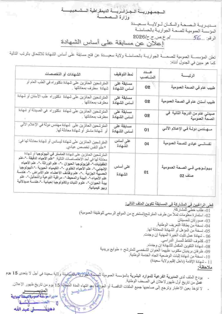 تعلن المؤسسة العمومية للصحة الجوارية بالحساسنة ولاية سعيدة عن فتح مسابقة على أساس الشهادة للالتحاق بالرتب التالية كما هو مبين في الجدول أدناه: