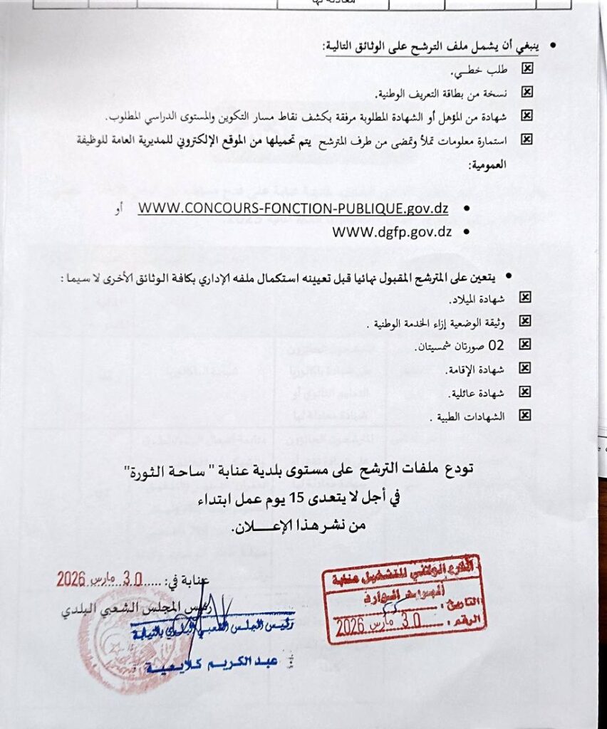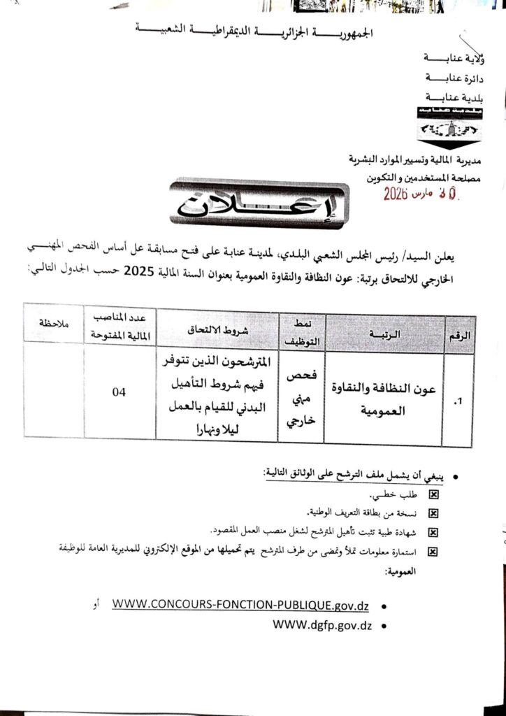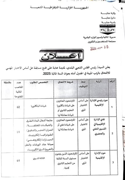 علن رئيس المجلس الشعبي البلدي لمدينة عنابة عن فتح مسابقات توظيف على أساس الاختبار المهني والفحص المهني بعنوان السنة المالية 2025، وذلك وفقاً للرتب التالية: