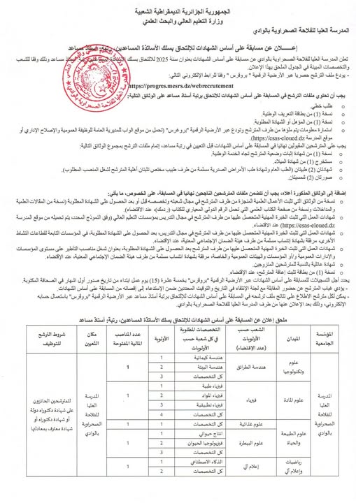 تعلن المدرسة العليا للفلاحة الصحراوية بالوادي عن فتح مسابقة على أساس الشهادات بعنوان سنة 2025، للالتحاق بسلك الأساتذة المساعدين (رتبة: أستاذ مساعد)، وذلك حسب الشعب والتخصصات المبينة في الجدول الملحق بهذا الإعلان.