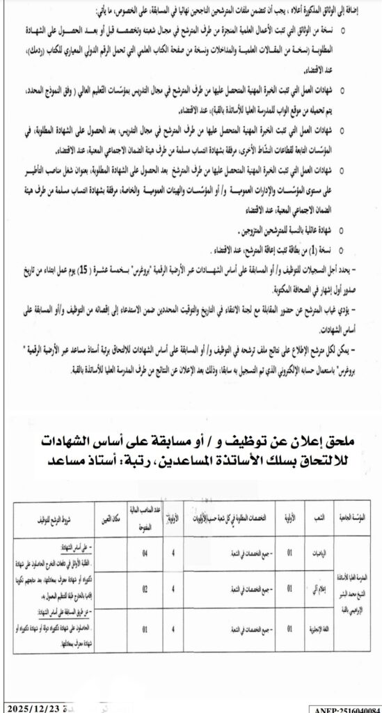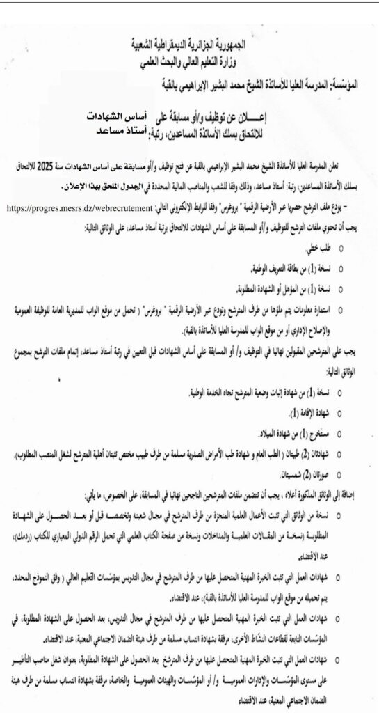 تعلن المدرسة العليا للأساتذة الشيخ محمد البشير الإبراهيمي بالقبة عن فتح توظيف و/أو مسابقة على أساس الشهادات بعنوان سنة 2025، للالتحاق بسلك الأساتذة المساعدين، رتبة أستاذ مساعد، وذلك وفقًا للشعب وعدد المناصب المالية المحددة في الجدول الملحق بهذا الإعلان.