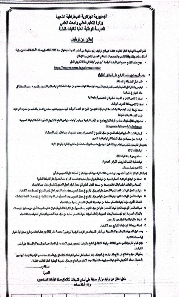 يودع ملف الترشح حصريًا عبر الأرضية الرقمية “بروغرس” من خلال الرابط التالي:https://progres.mesrs.dz/webrecrutement