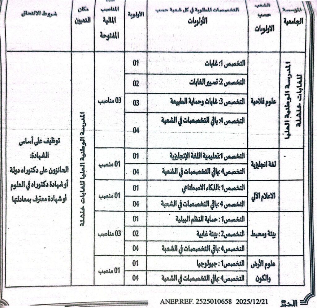 تعلن المدرسة الوطنية العليا للغابات خنشلة عن فتح توظيف و/أو مسابقة على أساس الشهادات للالتحاق بـ سلك الأساتذة المساعدين، في رتبة: أستاذ مساعد، وذلك وفق الشعب والتخصصات المبينة في الجدول الملحق بهذا الإعلان.