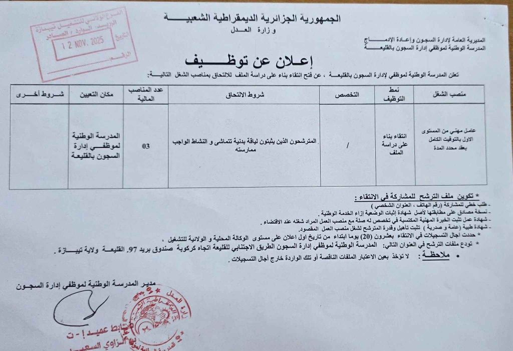 | عامل مهني من المستوى الأول بالتوقيت الكامل بعقد محدد المدة | انتقاء بناء على دراسة الملف | / | المترشحون الذين يثبتون لياقة بدنية تتماشى مع النشاط الواجب ممارسته | 03 | المدرسة الوطنية لموظفي إدارة السجون بالقليعة | / |