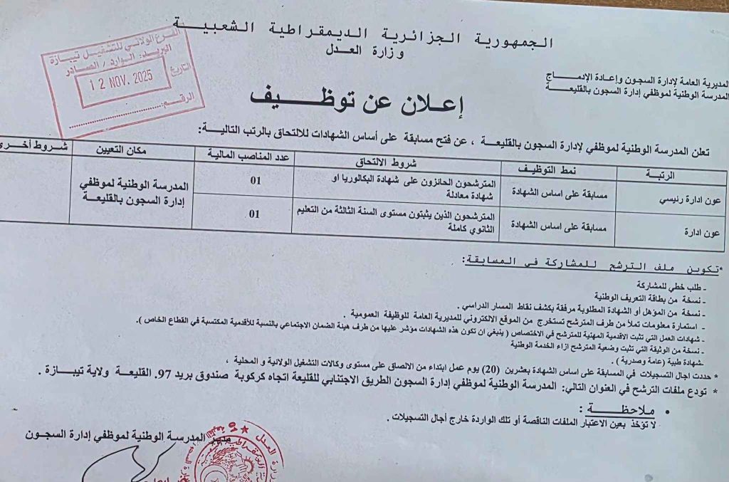 اعلان مسابقة توظيف بالمدرسة الوطنية لموظفي إدارة السجون بالقليعة