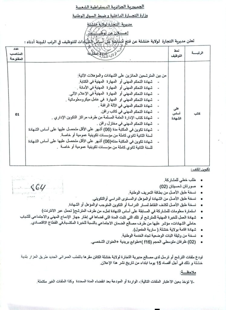 اعلان مسابقة توظيف بالمديرية التجارة لولاية خنشلة