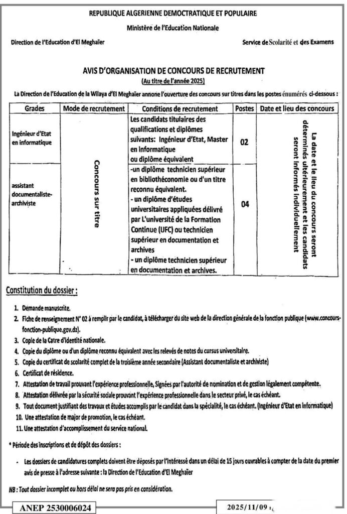 تعلن مديرية التربية لولاية المغير عن فتح مسابقات توظيف على أساس الشهادة (على العناوين) للالتحاق بالمناصب التالية: