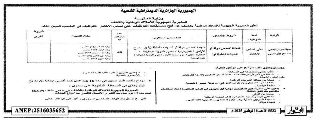 تعلن المديرية الجهوية للأملاك الوطنية بالشلف عن فتح مسابقات توظيف على أساس الاختبار للتوظيف في المنصب المبين أدناه:
