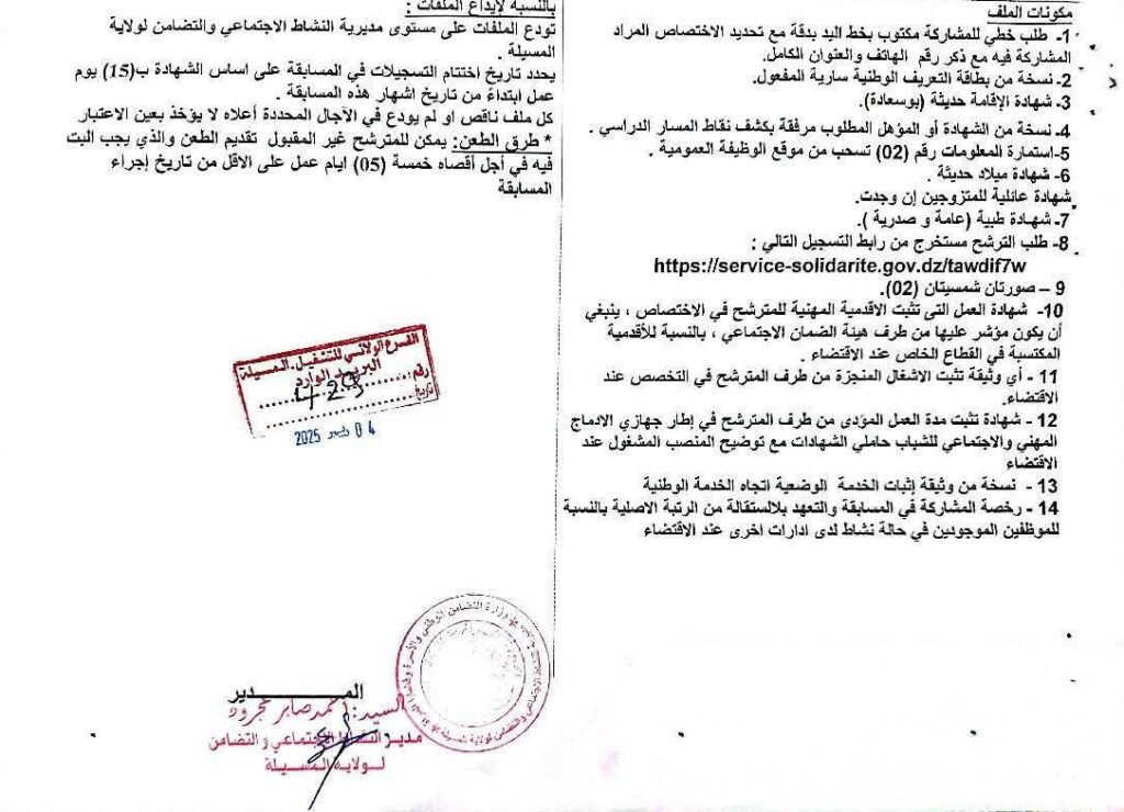اعلان مسابقة توظيف بالمديرية النشاط الاجتماعي والتضامن لولاية المسيلة