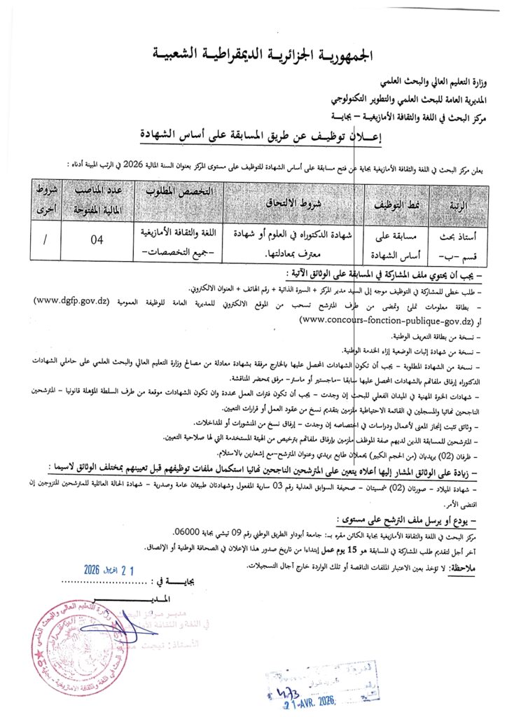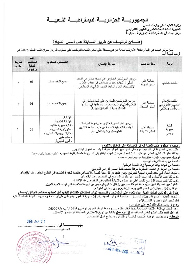 يعلن مركز البحث في اللغة والثقافة الأمازيغية ببجاية عن فتح مسابقة على أساس الشهادة للتوظيف على مستوى المركز بعنوان السنة المالية 2026 في الرتب المبينة أدناه:
